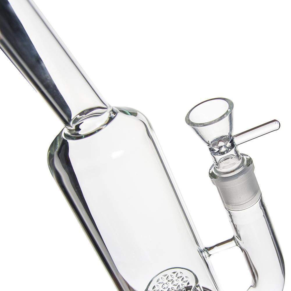 It features a 90 degrees angle 18mm female joint, the standard accessory is an 18mm male glass bowl for flowers, you can also pair a quartz banger to convert it into a dab rig/wax rig!Â