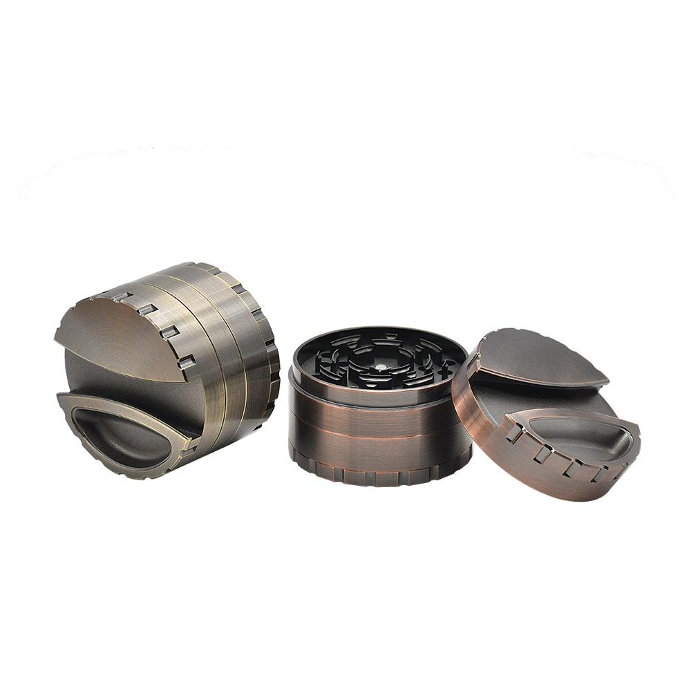 This Puffing Bird grinder is made of tough silver CNC-machined aluminum. This is a unique design that is not only a grinder, but a combination of a tiny ashtray, a rolling paper dispenser, and a joint holder. It is equipped with sharp, diamond-shaped teeth to gnash through your bud with great ease, a pollen screen, and a kief catching bottom piece to collect pollen dust that can be gathered for re-use. Gathering the pollen dust is made extremely easy with the included plastic scraper. A nylon friction ring ensures smooth, wear-free grinding.