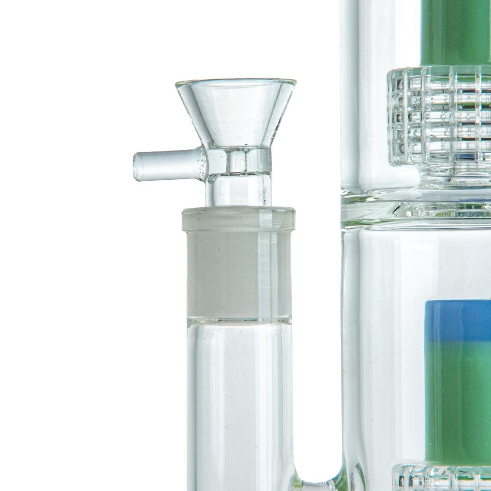 This bong features a sophisticated dual UFO percolator system with three water chambers, providing exceptional filtration and cooling. The UFO-shaped percs create a unique vortex effect, breaking the smoke into smaller bubbles for maximum diffusion. This advanced design ensures that each hit is smooth, flavorful, and less harsh on the lungs, making it perfect for both casual and seasoned smokers.