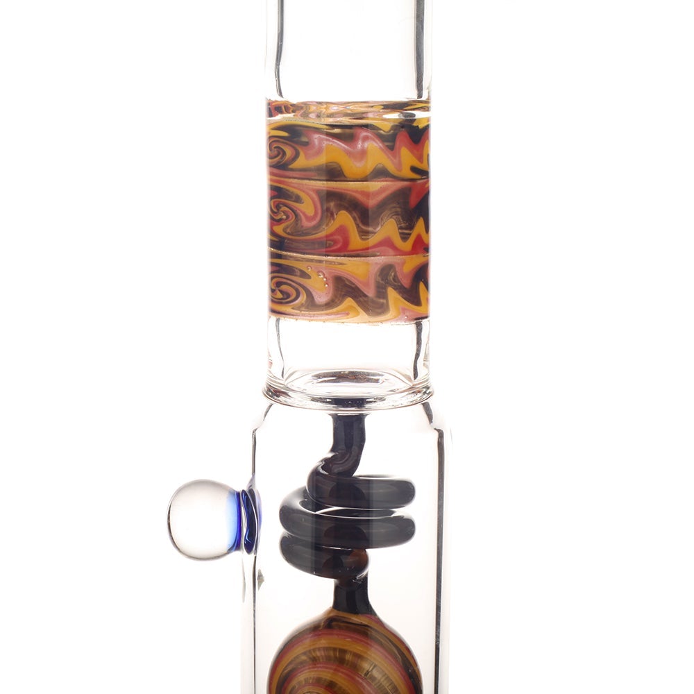 Made by our local glass artist. This two-part heady percolator beaker bong is genuinely one of a kind, stands about 18″/45cm tall with a 4.5″/12cm steady beaker base this water pipe is perfect for home use. It features a pretty heady perc which contains 2 swirls and a spinning patent ball, a glass marble on the outside for better grips and painted wigwag patent just below the flared mouthpiece. The beaker base also has a painted pinning patent on the bottom. The bong can be separated into 2 main parts, the tube and the beaker base, they are connected by the red clip that you see on the pics. This feature allows you to travel with it, no matter if you’re going to picnics or musical events, this bong will sure catch a lot of attention!Â