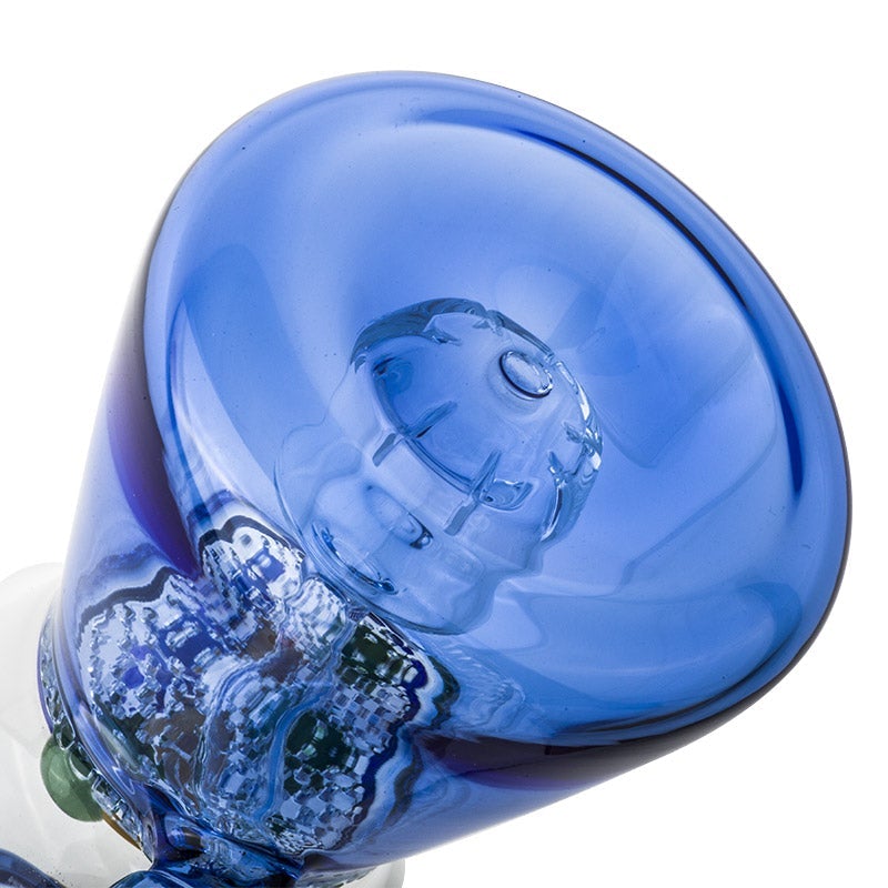 This water-bottle shaped glass bong features a medium size honeycomb percolator and a large size base, perfect for daily smoking or dabbing needs! There are five colorful beads on the percolator. The mouthpiece is straight and ensures longer uses on the table, this piece is made of thick high-quality glass that ensures lifetime usage. It weighs 357g, which is heavier than most of the bongs in Puffing Bird.